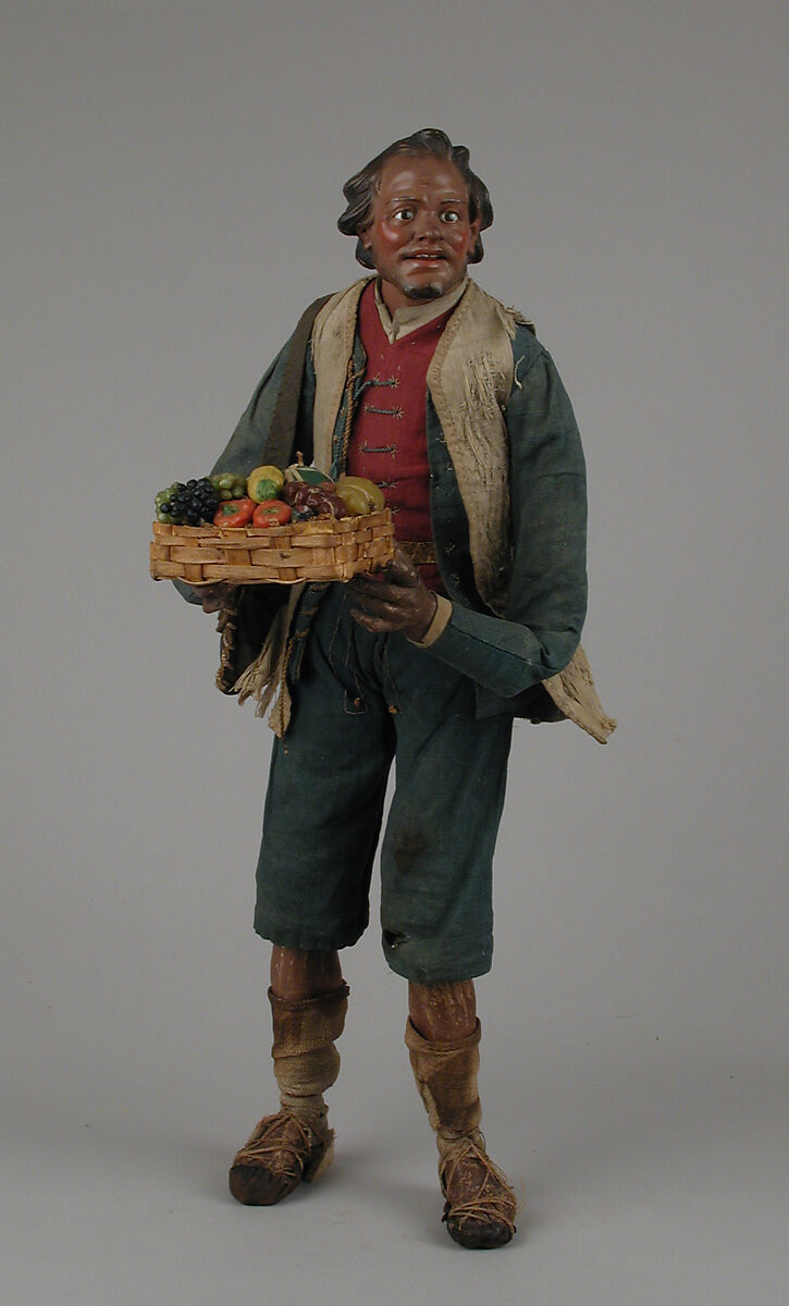 In 1964, Loretta Hines Howard generously presented to the Museum over 140 Neapolitan crèche figures, dating from the second half of the eighteenth century. The varied assortment includes figures from the three traditional scenes of a complete Neapolitan presepio: the Nativity, with angels, shepherds, and sheep; the procession of the three Magi, with their colorful retinue of attendants; and the varied and gay crowd of country and town people thronging the tavern, or inn, of Bethlehem — the diversorium mentioned by St. Luke, where on the Holy Night there was no place for Mary and Joseph. Averaging between twelve and fifteen inches in height, according to the position they were to take in perspective in the stage set, the figures are pliable and can be given poses at will, according to their facial expressions. Their bodies are made of tow and wire, their arms and legs are finely carved of wood, and their heads and shoulders are modeled of terracotta and accurately finished. Their attire, often enriched by accessories, jewels, and embroideries, is a sheer joy for the lover of folklore and eighteenth-century costumes.