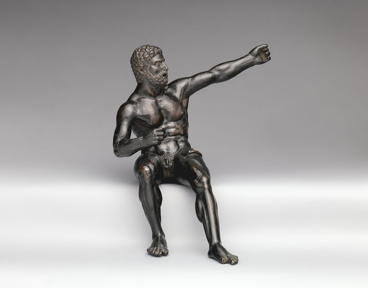 While this bronze and its subject telegraph fortitude, it has sustained significant damage. Over roughly half a millennium, it incurred breakages to both arms. The bent right arm was fractured below the elbow (which is itself original), and the existing forearm and hand are later replacements.[1] The left arm was broken at the bicep but subsequently reattached; the proper left index finger and big toe are missing. Both of the lower legs were filled with metal for cast-in repairs. Such vulnerabilities in the bronze were the result of its thin, even walls achieved through an indirect cast. The buttocks were filed down, which previously enabled the sculpture to nestle on a gently sloping stone base.[2] Because of this filing, it is unknown what kind of base the figure may have originally had, or whether it was originally balanced upright while seated on a flat surface, perhaps straddling the edge of a table or shelf.