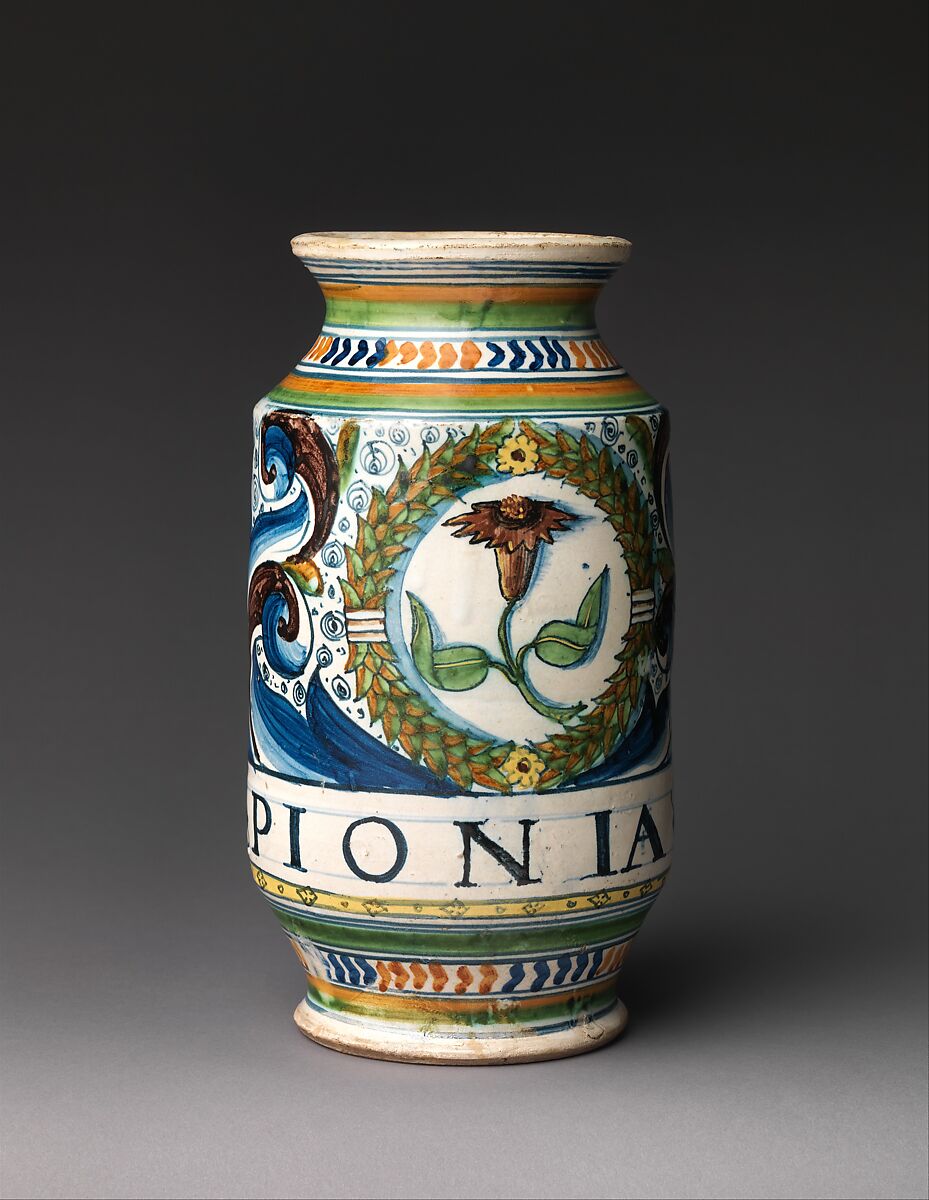 Storage vessels were among the most frequently produced maiolica wares in late medieval and Renaissance Italy. Made in fairly standard shapes, they were designed to fit with dozens of others on a shelf, often in a pharmacy or shop. Their handles therefore tend to fit within the vessel’s profile, and the cylindrical albarello type is generally narrower at the middle than at the top or bottom, making it easy to grip. Other common features include inscriptions indicating contents and flanged lips to help secure cloth or paper seals. The decoration, usually more elaborate on one side than the other, can sometimes link pieces to a known dispensary or specific workshop or artist.