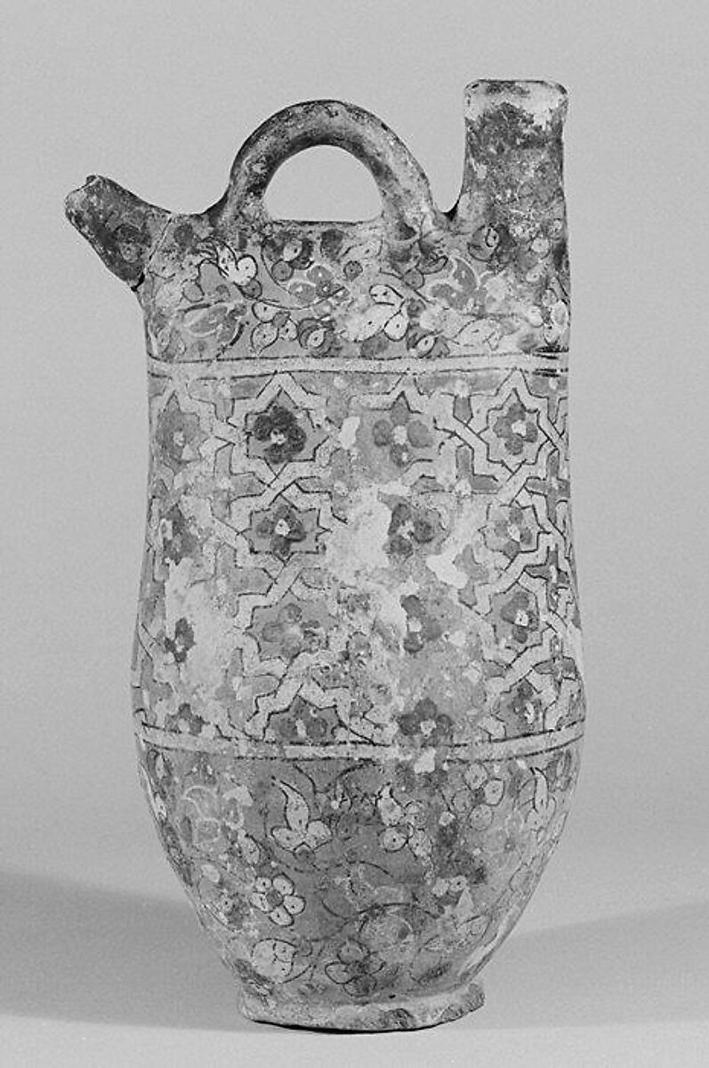 The form of the jugs shows schematically the near eastern type of leather water bottle made from a whole kidskin.