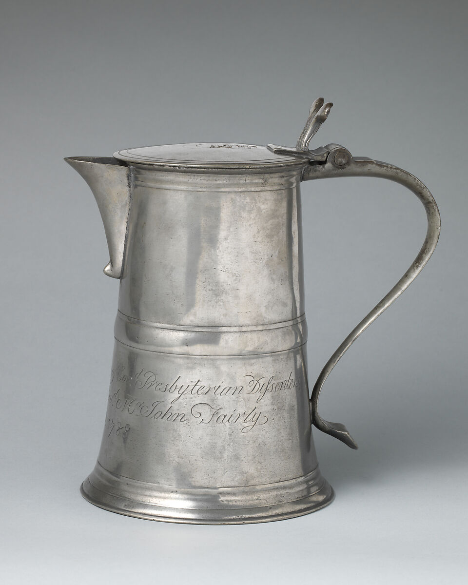 The inscription on this flagon indicates that it and a pewter chalice (65.199.5) belonged to the same congregation under the ministry of John Fairly.