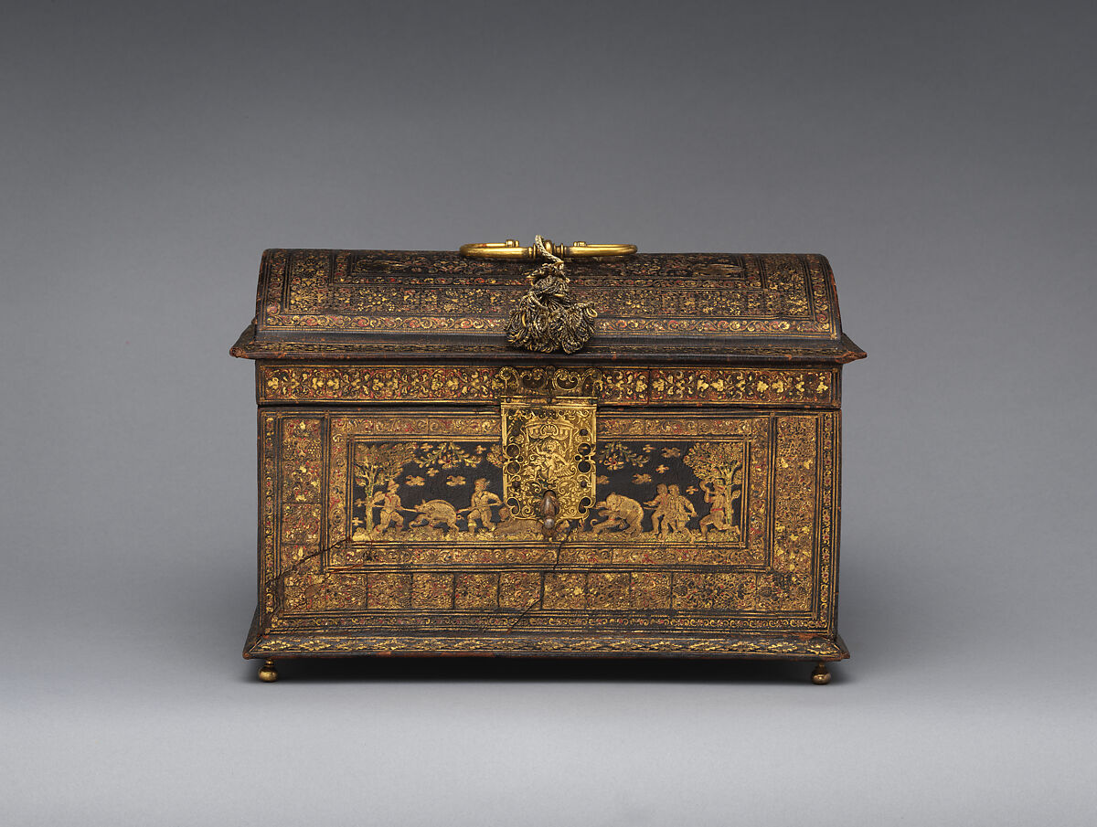 The coffer was probably intended to contain a dowry. Scenes of the front and back depict hunts for wild boar and bear; the figures on the sides are from classical mythology.