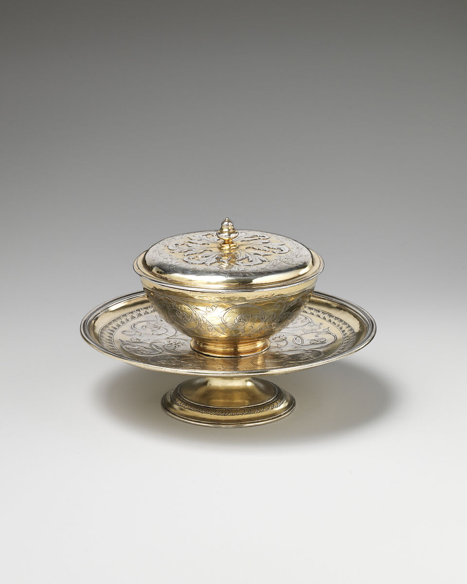 This bowl may have formed part of a traveling set similar to one by the same maker, formerly in the collection of Viscount Monck, inscribed: "A Bartlemew Fairing sent by his Grace the Duke or Ormond to Fridasweed Lady Stephens". The decorative engraving on this set and our bowl and stand were undoubtedly executed by the same artist and derived from one source of design, either by Simon Gribelin or under his influence.