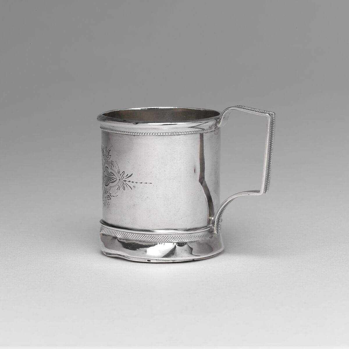 This mug formerly belonged to the New York silversmith William Forbes, who was active from 1826–1863.