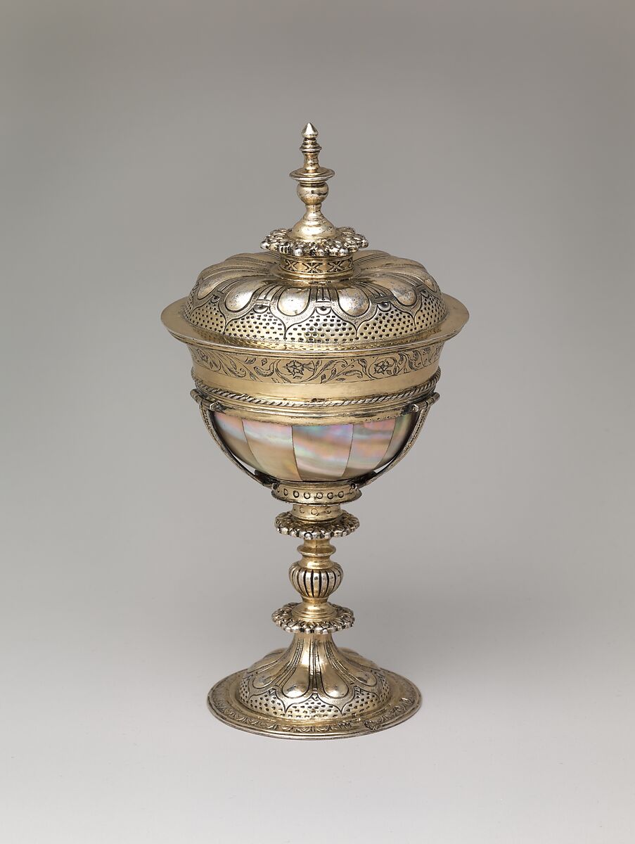Principally sourced from the interiors of exotic shells, Indian mother-of-pearl was admired and sought after by Europeans, and imports sold at astronomical prices. Though some vessels worked by Gujarati craftsmen (from Western India) were kept in their original forms, others—such as this one—were carefully dismantled and their mother-of-pearl inlays set in new precious-metal mounts. The extremely delicate gilded silver foot and cover decorated with miniature heraldic roses locate this piece to Elizabethan London.