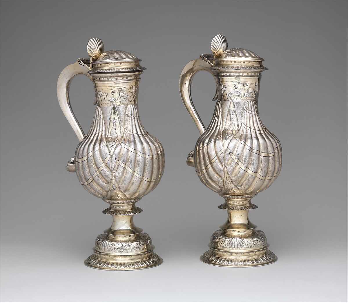 The decoration on these ewers, which shows dolphins frolicking in the waves, was done by a great master who was at ease with his tools, capable of improvising and animating his subject. Used for wine, the ewers are believed to have been part of the famous Paston Treasure, a collection of exotica recorded in a still life in the 1660s.