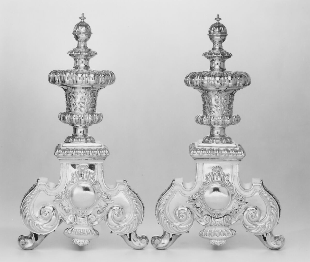 When ornamented, iron fire dogs were typically fronted with brass or, occasionally, enamel on brass. These pieces by Benjamin Pyne are two rare survivals in silver. Pyne had a long career as a goldsmith in London and much of his work for municipalities and churches has survived; in 1715, he was appointed Subordinate Goldsmith for the coronation of the first Hanoverian king, George I, and in 1725 he was elected Prime Warden of the goldsmiths' guild.