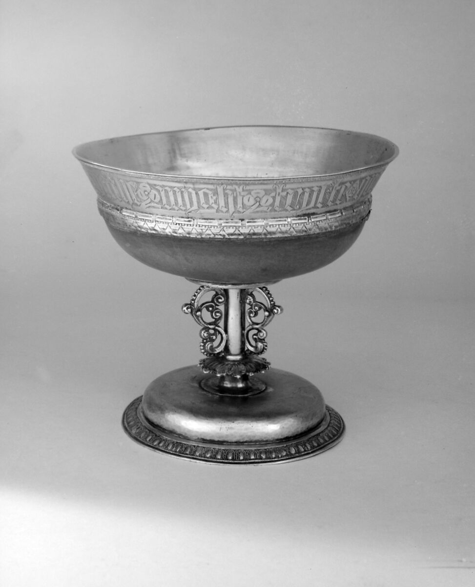 The inscription reads "Quod wele ware hym yat wyste in whome yat he myght tryste" (How good it is for him who knows whom he can trust.) The arms at the bowl center are those of the Lee family of Ditchley and Quarendon who owned the mazer in the seventeenth century.