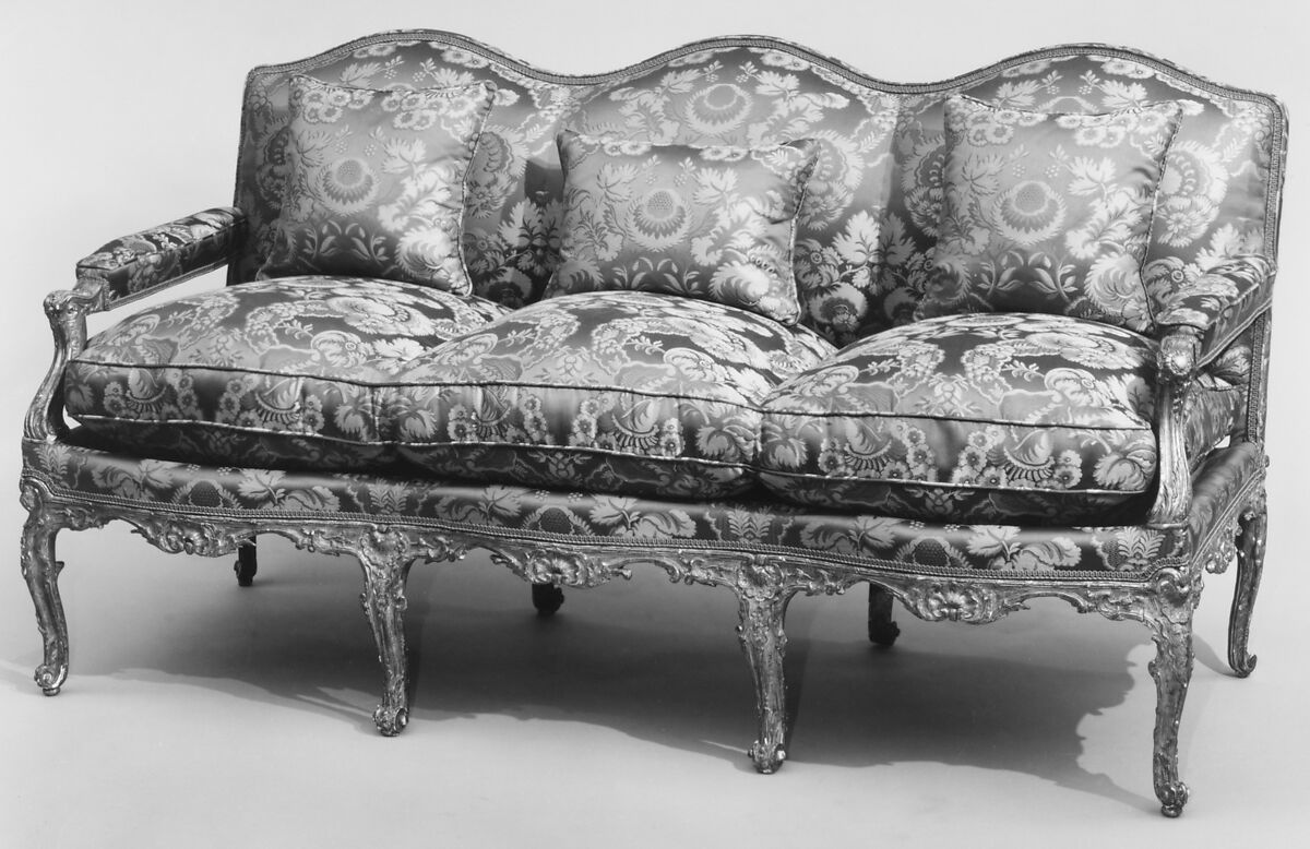 - Medium: Carved and gilded walnut; upholstered in modern red/beige damask