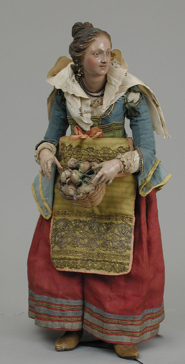 - Medium: Polychromed wood and terracotta; raffia, cloth and straw, pearls
