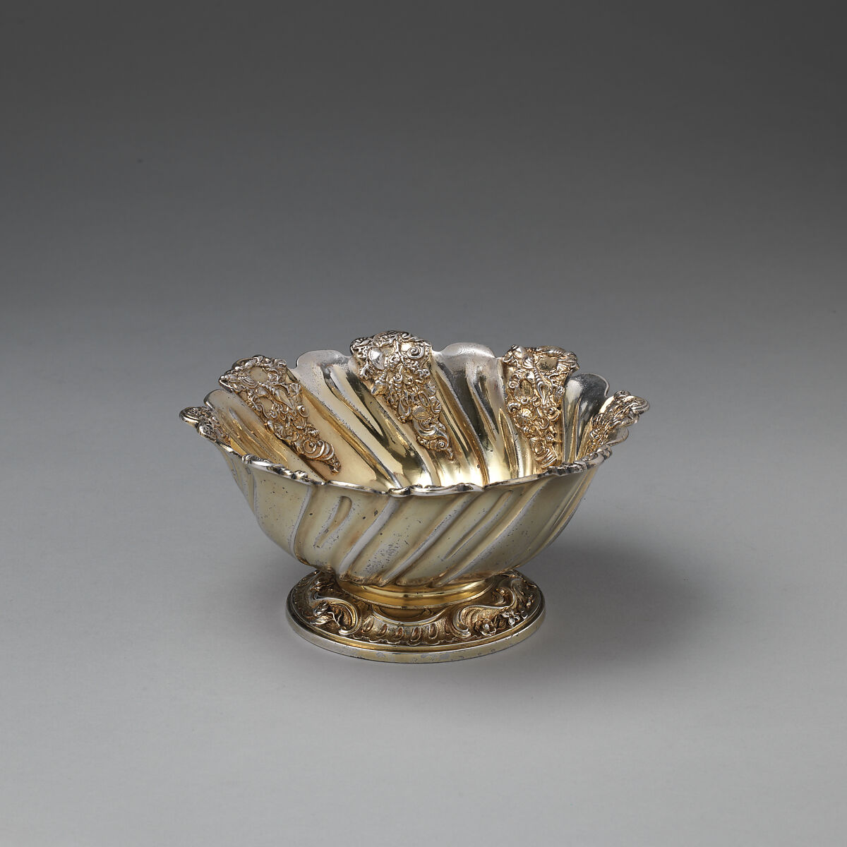 The arms of William Anne Capel (1732–1799), fourth Earl of Essex, are engraved at the center of this bowl, which was probably part of a tea set. The small scale of the cast and applied shell decoration is characteristic of Wickes's Rococo work.