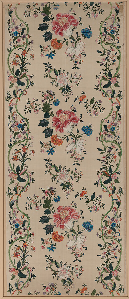 Thin silks painted with flowers, birds, and butterflies for dress lengths, fan leaves, and screen panels were the final phase of China’s ancient silk trade with the West. The soft ecru ground of this unusual example, suggesting some special kind of unbleached silk, enhances the pearly quality of the white lotus and clematis petals.
