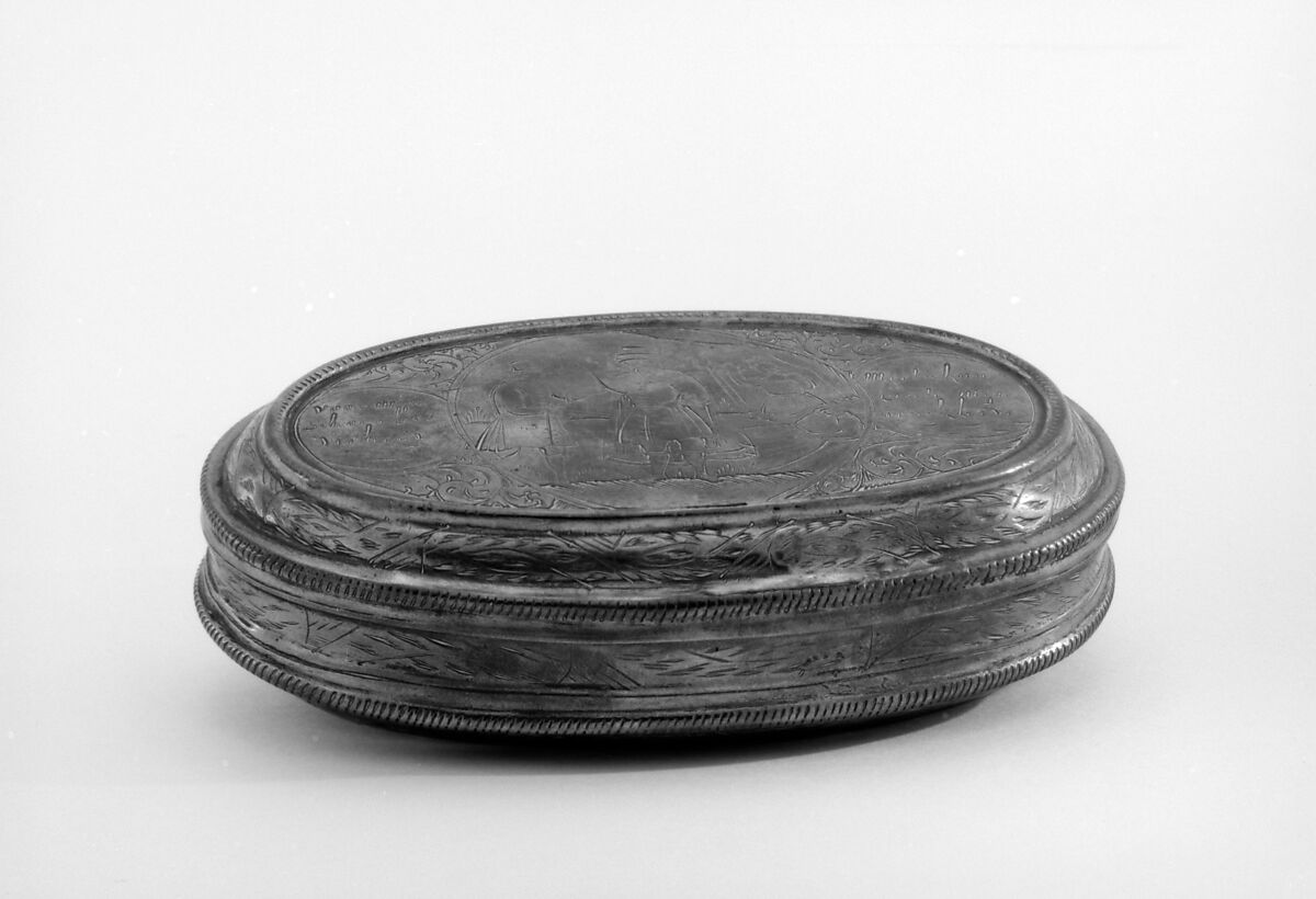 The inscription found on the underside of this box is also recorded by Julien van der Linden, "Les boîtes en cuivres dites tabatières hollandaises," Annales de la Société d’Archéologie de Bruxelles 15 (1901), p. 210.