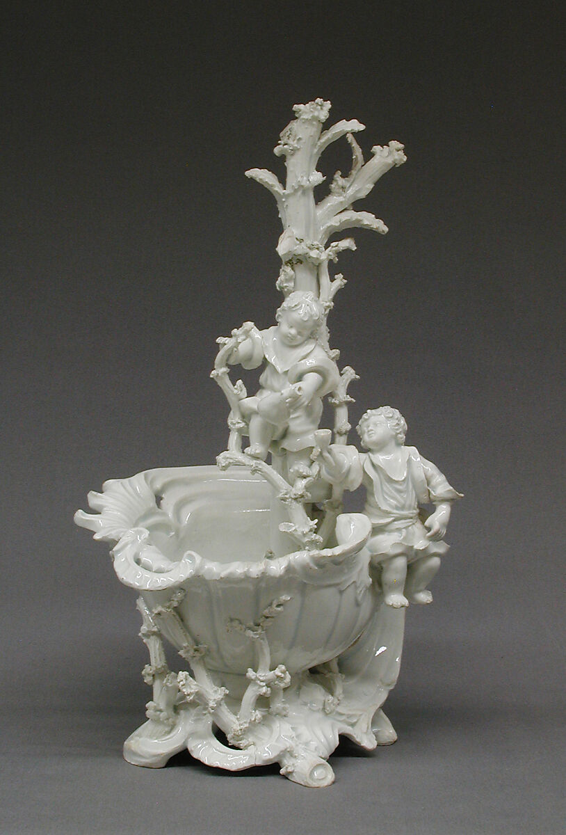 When discharging its function as a container for liquid, this object also completed the allusion of the decoration, two small boys perched by a pool from which one may be presumed to have filled his bottle. The playfulness and the style of the rococo survived together in Italian ceramics to the end of the eighteenth century.