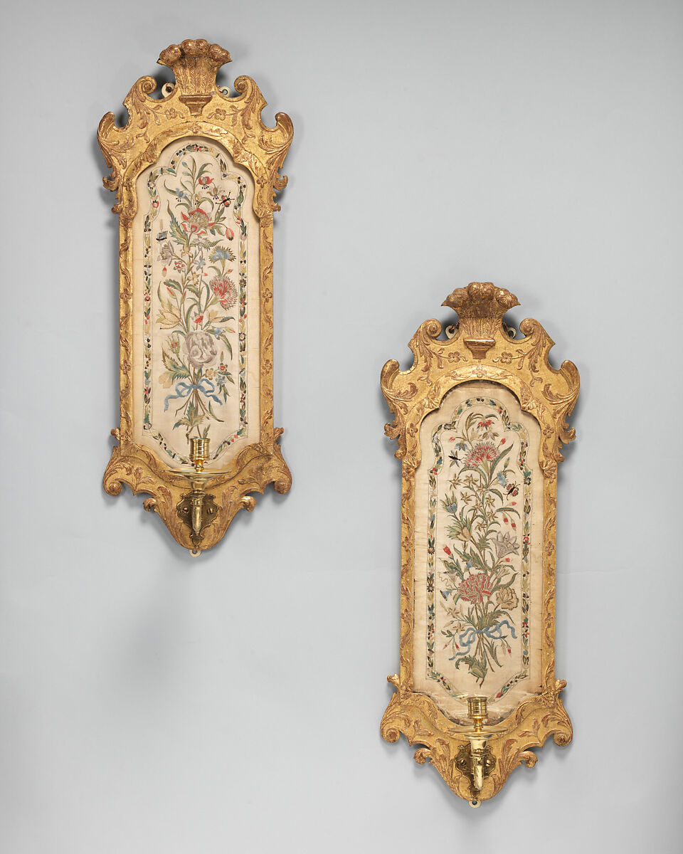 - Medium:Gilt gesso on pine, gilt bronze and silk embroidery