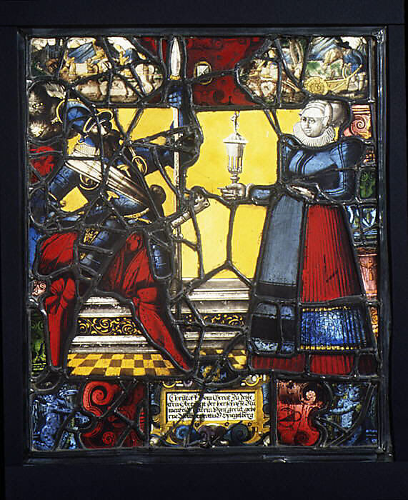 This panel—the work of an anonymous glass painter after an anonymous designer—is a typical example of the many windows that brought light and bright colors to the dark rooms of Swiss sixteenth-and seventeenth-century houses. As indicated by the inscription, it represents two burghers from Jestetten (a border town in present-day Germany), Christoff vom Greüt and his wife, Catrin. The figures should be considered representations of the patrons rather than actual portraits.