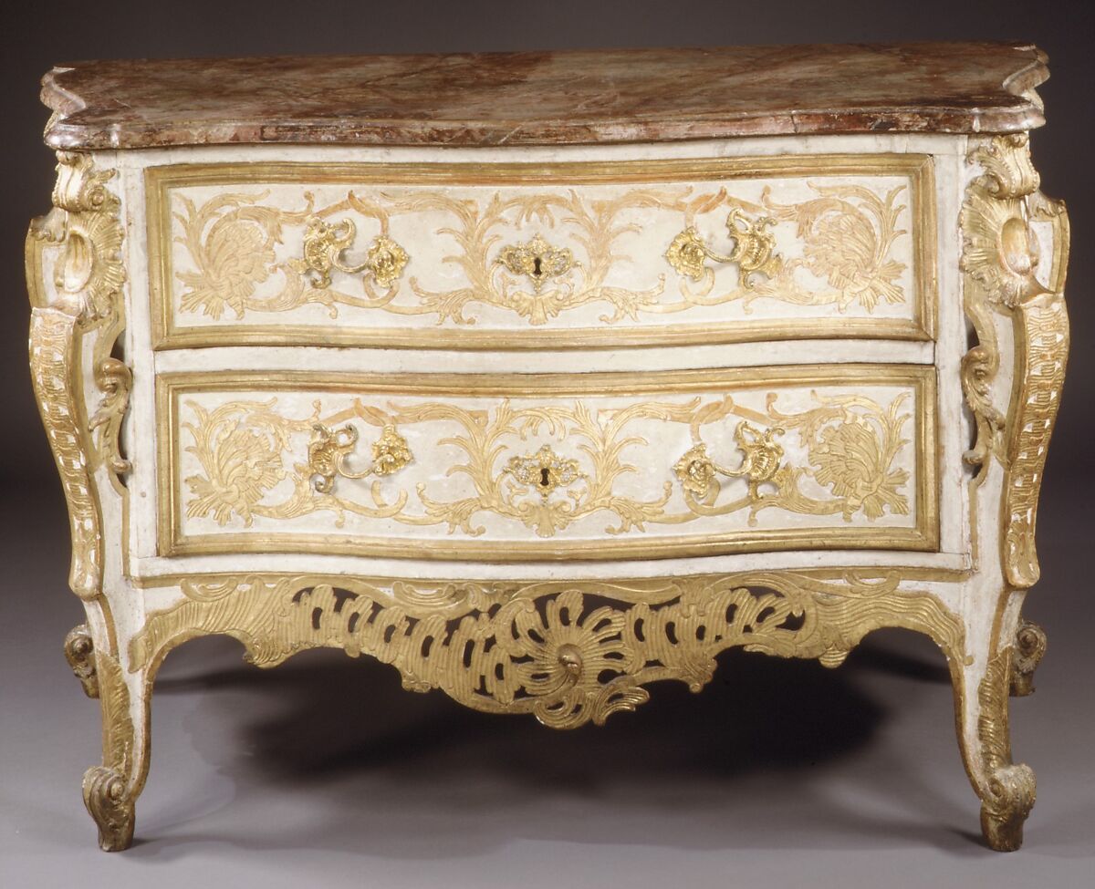 The decoration, gilded carving on a milky white ground, would have corresponded closely with the carved woodwork décor of the room in which it stood, for such commodes, like console tables, were made to complement their surroundings. A French-trained architect, François de Cuvilliès (1695–1768) provided designs of similar commodes intended for Bavarian rococo palaces.