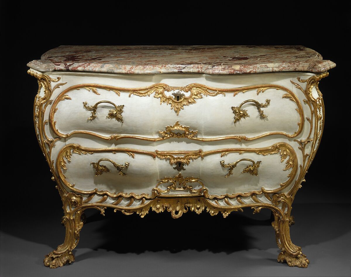 The undulating lines of the front and sides suggest that its creator had seen the swell-fronted painted or lacquered commodes made in Venice in the mid-eighteenth century. The carved motifs are thought to have been carried out in the studio of Ferdinand Tietz (1708–1777). He is known to have provided large stone figures for the gardens of Seehof Castle, whence came this piece.