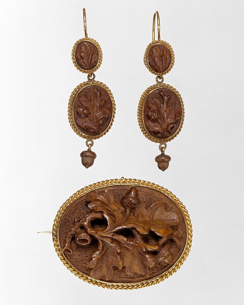 These earrings belong to a demi-parure that also includes a matching brooch. Wood from the “Charter Oak” tree is carved in relief with oak branches and acorns, and held in articulated gold dangle settings with twisted rope borders. A tiny acorn, carved-in-the-round, dangles from the bottom of each earring. Inscribed in ink on the reverse is “Original/Charter/Oak/Hartford/Conn.” The demi-parure retains its original leather-covered case with a pale green satin and velvet interior, marked in gold “TIFFANY & CO./550 Broadway 552/NEW YORK.”