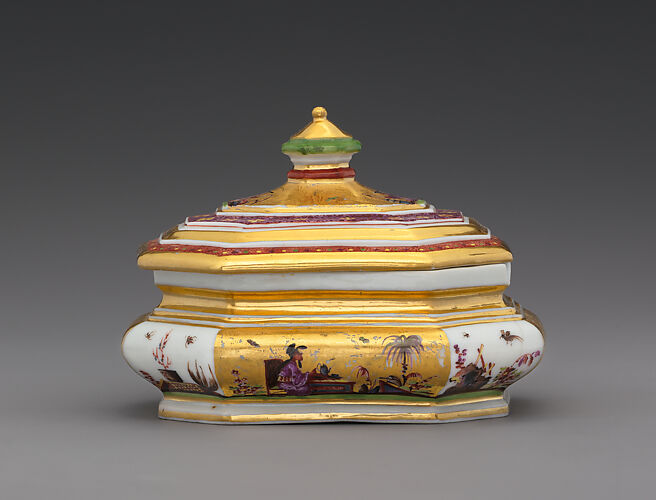 The pieces of this service (1974.356.424–.430) come from one of the most richly decorated Meissen tea and coffee services. The gold background was added after the enamel was fired, either at the factory or in Augsburg, where the gilt-silver mounts were applied. This model was the most commonly produced at Meissen in the 1720s and 1730s. The design of the low octagonal sugar box dates to the earliest years of the factory; this example can be assigned to 1726–27 based on stylistic grounds as well as the factory mark KPM on the base.