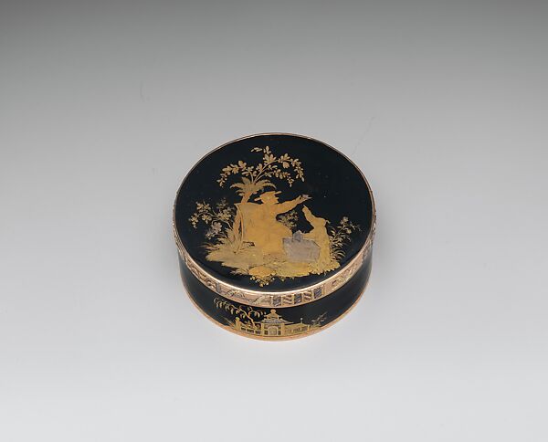 Precious boxes made for confections and sweets were known as drageoirs or bonbonnières. Unlike snuff containers, the lids of such boxes, which are usually circular, are not hinged. Here, the charming chinoiserie decoration painted in gold and platinum on a black ground clearly imitates lacquer. It may have been inspired by the "black lacquer" porcelain made at Sèvres during the 1790s.