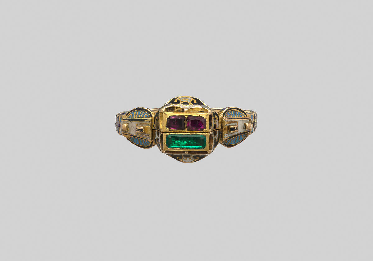 This two-part ring of interlaced gold hoops is inscribed with a German phrase that translates to “Those whom God hath joined together let no man put asunder.” This type of ring was commonly used as a wedding band during the Renaissance. A gimmal ring with a similar message featured in the marriage ceremony of Protestant reformer Martin Luther (1483–1546) and Katharina von Bora (1499–1552), a former Cistercian nun.