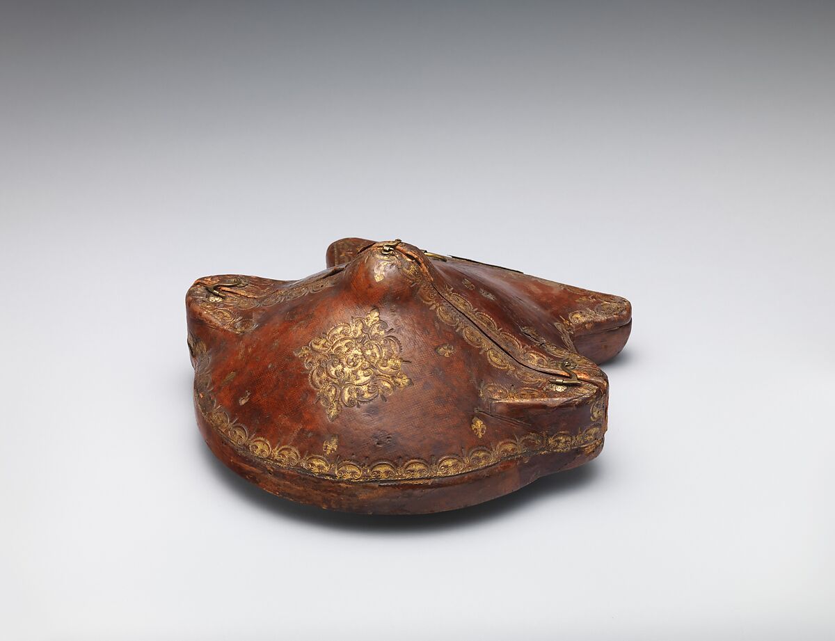 - Medium: Dyed and gold-tooled leather; brass hooks and eye