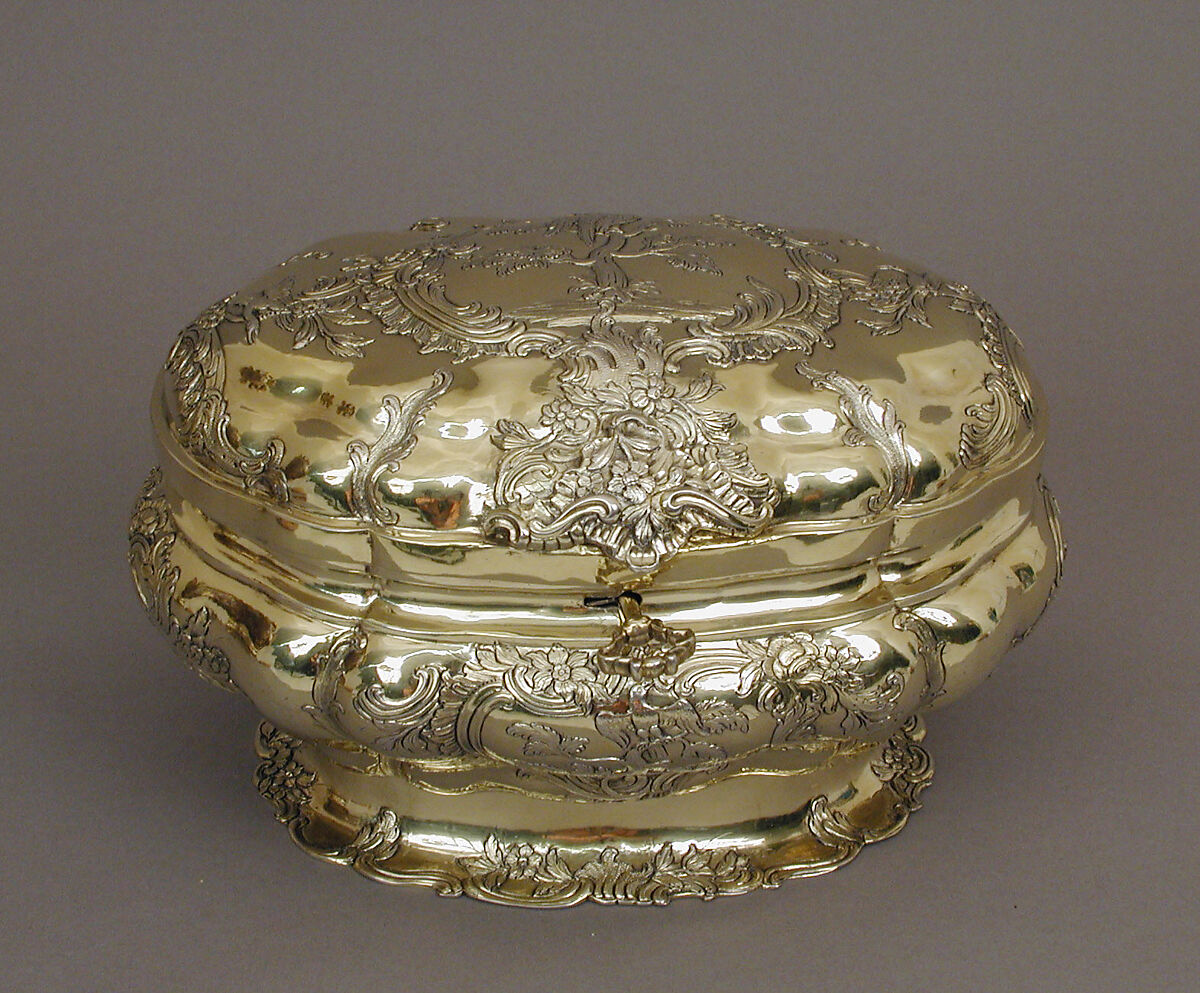 The boxes and accoutrements of a toilet service were often made for stock; so, rather than being specially commissioned, a service might be assembled from pieces that were already on the shelf. The whole was usually supplied in a fitted leather case; as a household moved from country to city for the annual season, they transported their silver as well. Gottlieb Satzger was a younger brother of Johann Martin Satzger I, who marked the smaller boxes of the same model.