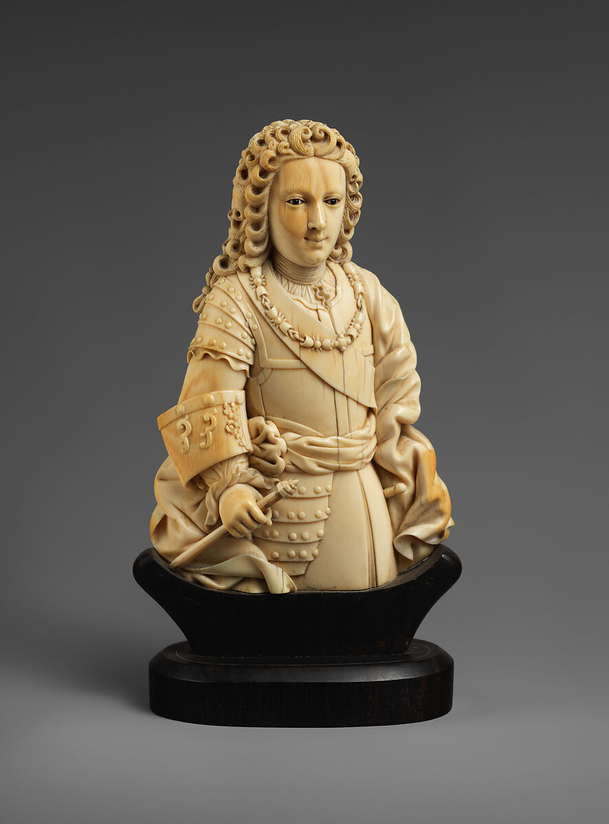 The chain around the man's neck may represent the Order of the Golden Fleece, awarded only to Catholic dignitaries. It is unclear whether the pair (see pendant bust 1975.433.2), designed for export, was intended as actual portraits (perhaps representing the Spanish viceroy and his wife, who ruled the Philippines from Mexico City), but the carver no doubt based his work on an engraved or painted European model.