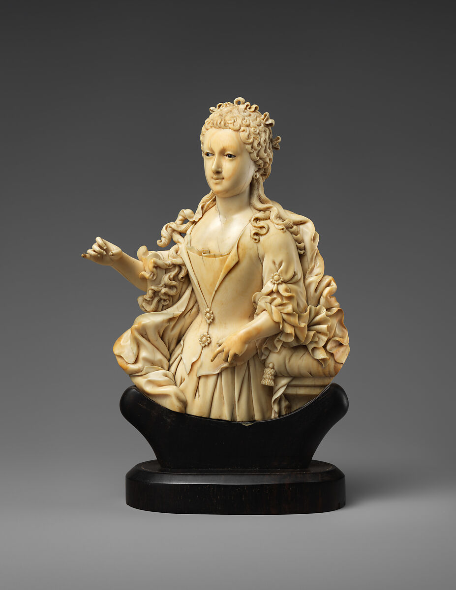The chain around the man's neck (see pendant bust 1975.433.1) may represent the Order of the Golden Fleece, awarded only to Catholic dignitaries. It is unclear whether the pair, designed for export, was intended as actual portraits (perhaps representing the Spanish viceroy and his wife, who ruled the Philippines from Mexico City), but the carver no doubt based his work on an engraved or painted European model.