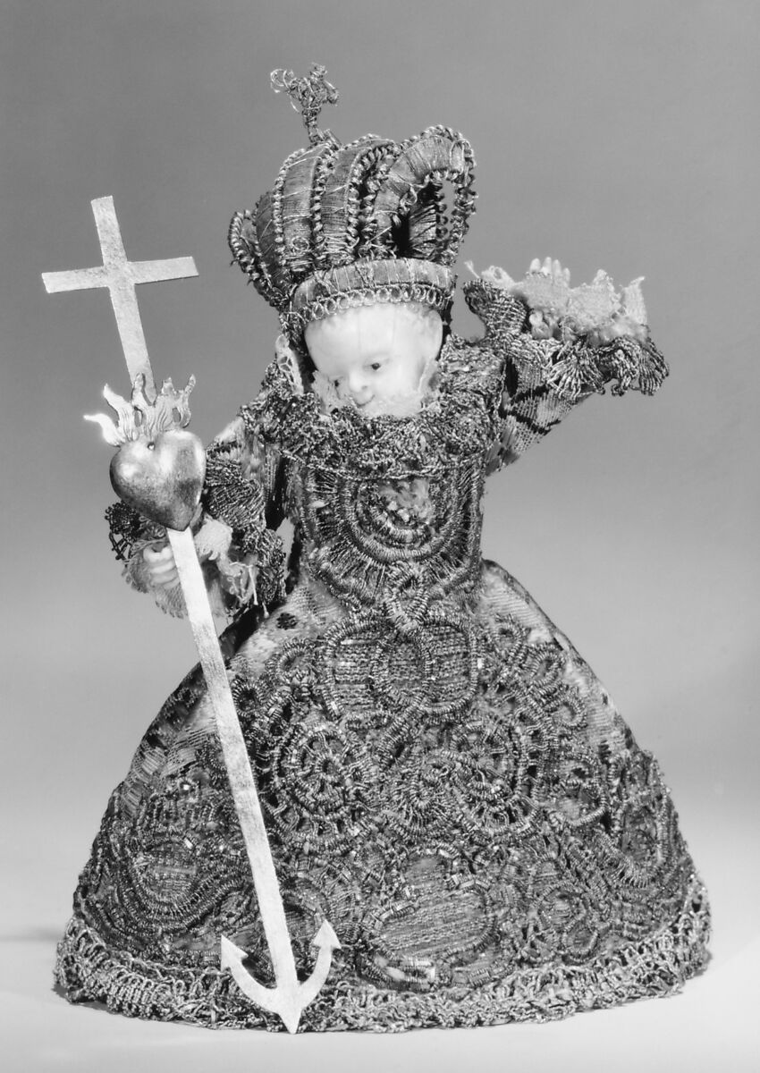 Enclosed in 1975.437.3a, b, a carved and polychromed vitrine. This type of figure, called "Bräutigam-Typus", was made for nuns upon profession of vows and becoming "bride of Christ." See 24.80.92 for another example of this type. The devotional emblem (d) can be read as follows: cross = faith, flaming heart = devotion, anchor = hope.