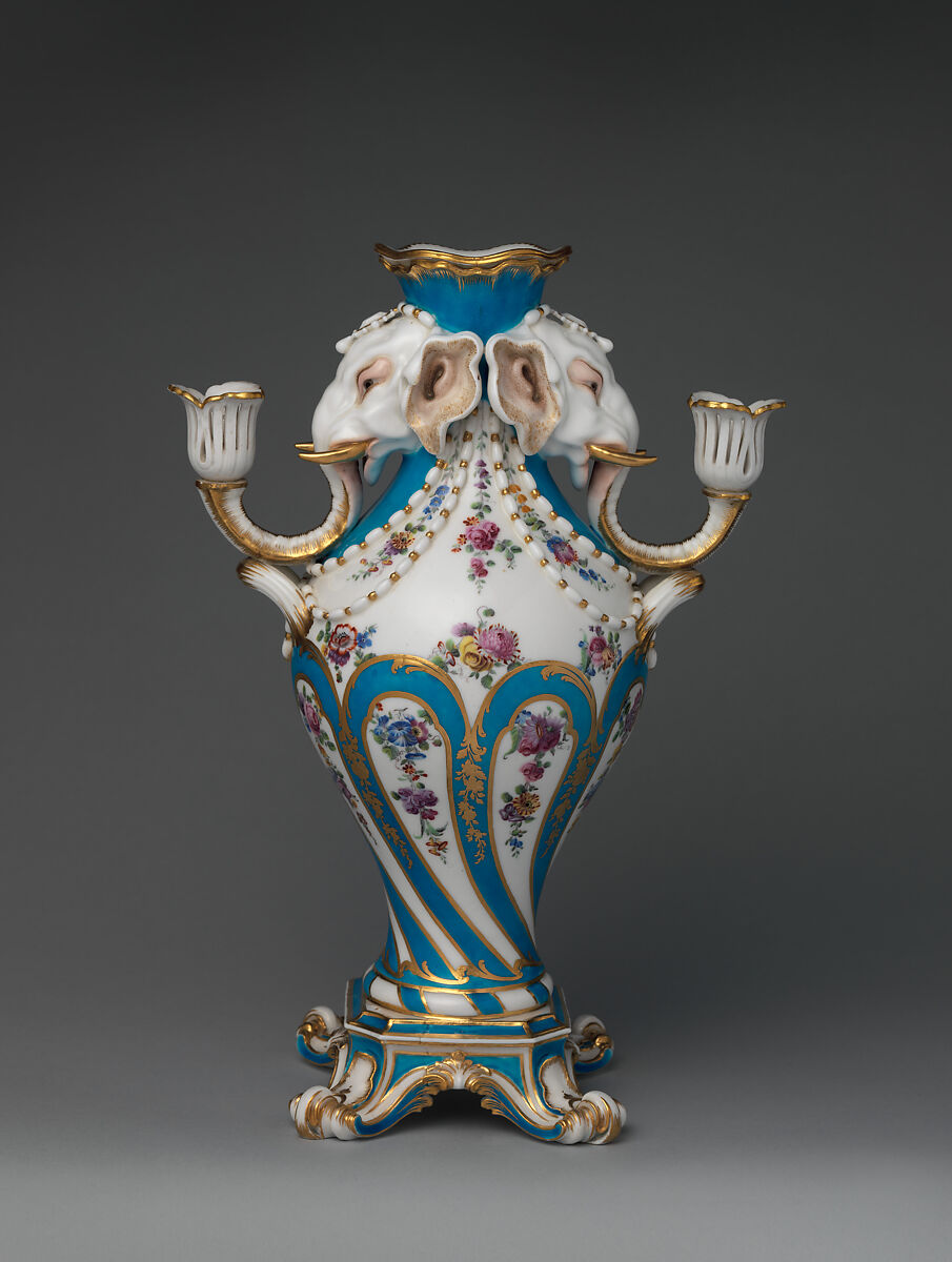 The design of this vase, one of the few models intended to also serve as a candle holder, is attributed to Jean-Claude Duplessis, the head of the sculpture workshop at Sèvres. Elephant-head vases were produced in two slightly different versions. According to Savill (p. 154), one version (shape A) was made without the small handles under the elephant’s trunks, while shape B includes handles and beading on the elephant heads that loops through the handles (as on 1976.155.61). Shape B is more common than A. Elephant-head vases of both designs were made in three sizes, of which this is the second or middle size.