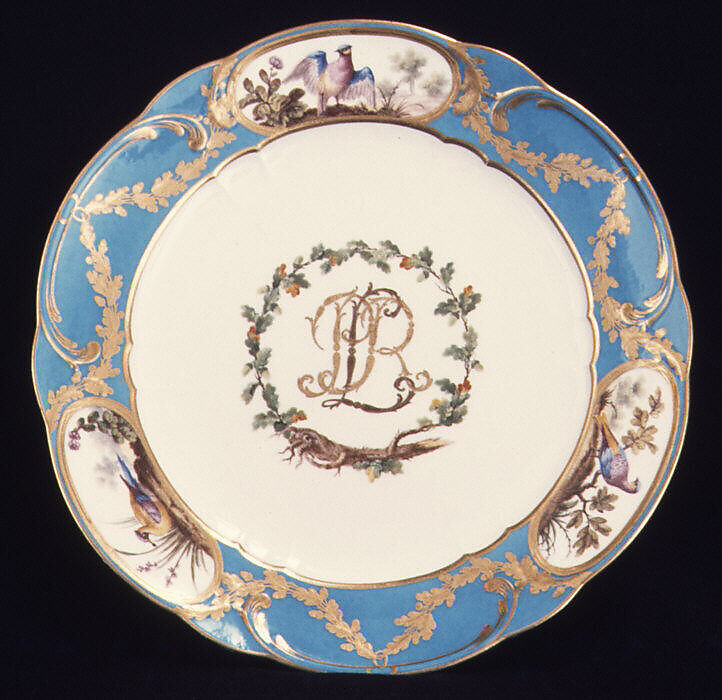 This plate is one of twenty-three pieces from the Rohan service now in the Museum’s collection. Originally composed of 368 pieces, the service was small in size compared to other Sèvres services, but the rich use of gilding, the expensive ground color, and the initials in two tones of gold account for its high cost.