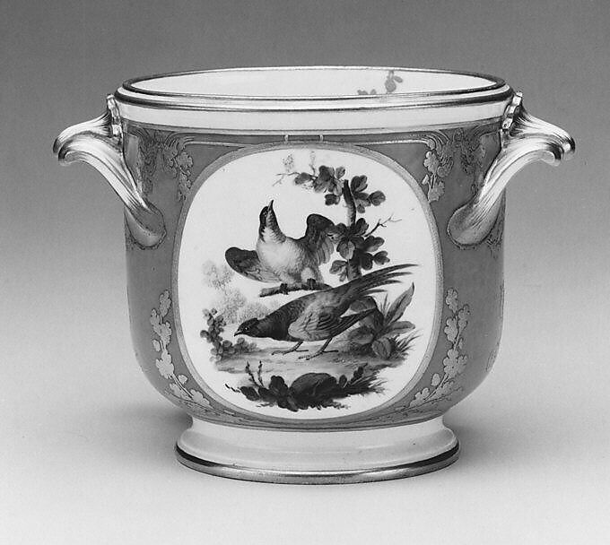 This wine bottle cooler is one of twenty-three pieces from the Rohan service now in the Museum’s collection. Originally composed of 368 pieces, the service was small in size compared to other Sèvres services, but the rich use of gilding, the expensive ground color, and the initials in two tones of gold account for its high cost.