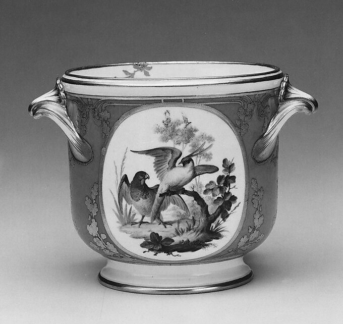 This wine bottle cooler is one of twenty-three pieces from the Rohan service now in the Museum’s collection. Originally composed of 368 pieces, the service was small in size compared to other Sèvres services, but the rich use of gilding, the expensive ground color, and the initials in two tones of gold account for its high cost.