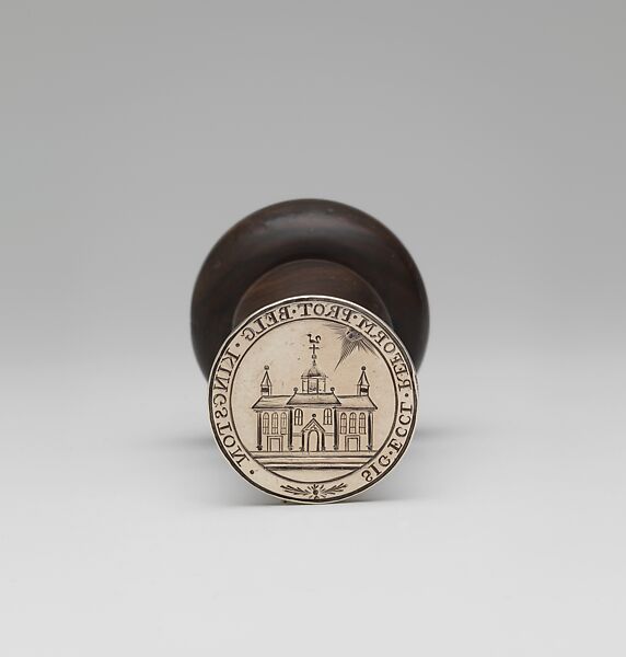 The building represented on this seal is thought to be the Cathedral at Dordrecht, Holland, in which the great Synod of Dort held its session. The seal itself was used for generations in the First Reformed Church at Kingston, New York, founded in 1659. There is a tradition that links this seal with the name of the silversmith, Benjamin Wynkoop, although whether he presented it to the church or had some share in its production is difficult to determine. It is believed to have been first used around 1725.
