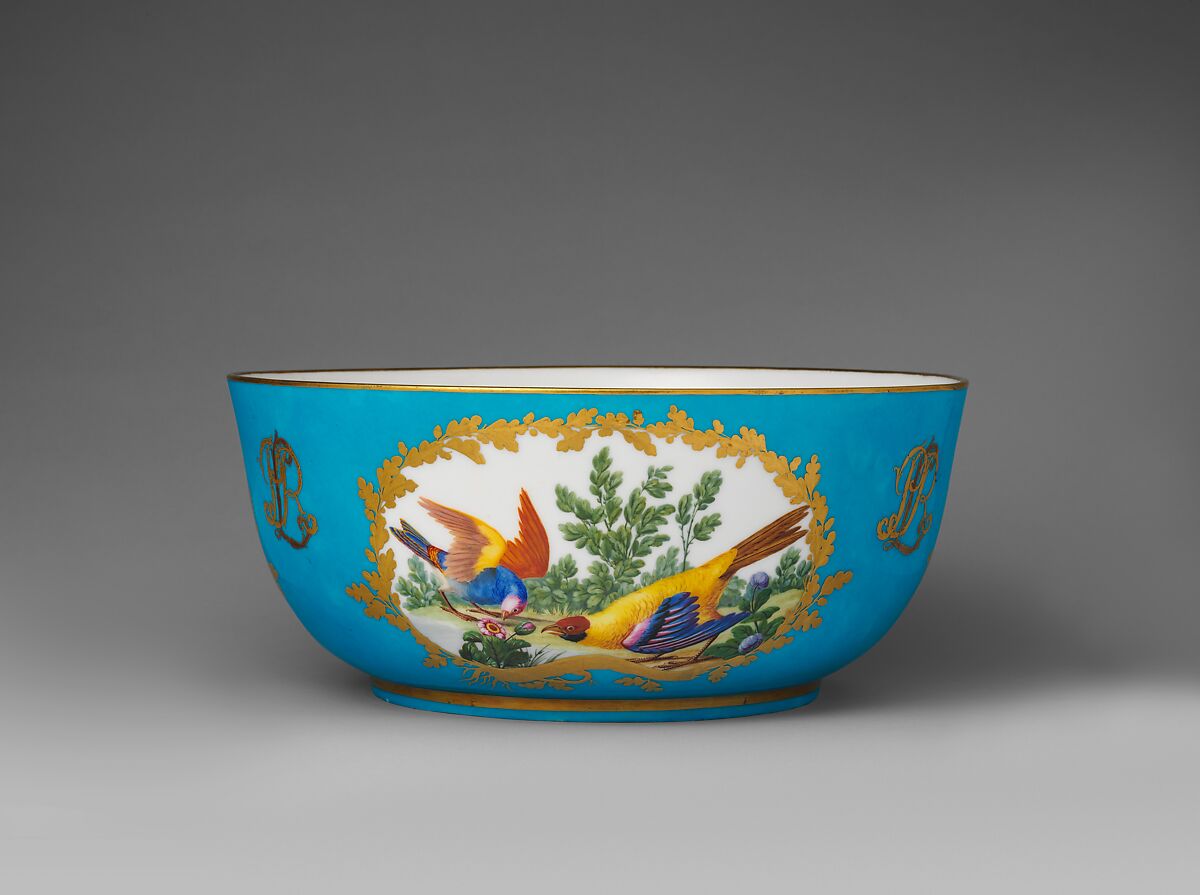 This punch bowl is one of twenty-three pieces from the Rohan service now in the Museum’s collection. Originally composed of 368 pieces, the service was small in size compared to other Sèvres services, but the rich use of gilding, the expensive ground color, and the initials in two tones of gold account for its high cost.
