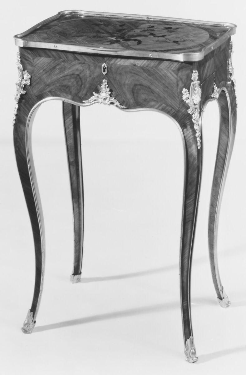 This small work and writing table by Bernard II van Risenburgh is made of oak veneered with tulipwood and end-cut kingwood, and mounted with gilt bronze. The hinged top opens to reveal a partitioned recess divided into three sections. A separate drawer opens on the right side of the table, which contains a narrow compartment with a silvered metal inkwell, a trough for a sponge, and a box for sand to blot up excess ink. Although not nearly as ornate as the Asian-style lacquered corner cabinets produced by van Risenburgh in the museum’s collection (1983.185.2a, b), this piece demonstrates the persistent Rococo aesthetic found throughout the master cabinetmaker’s work, and his care in coordinating asymmetrical gilt-bronze mounts with the serpentine outline of the small table.