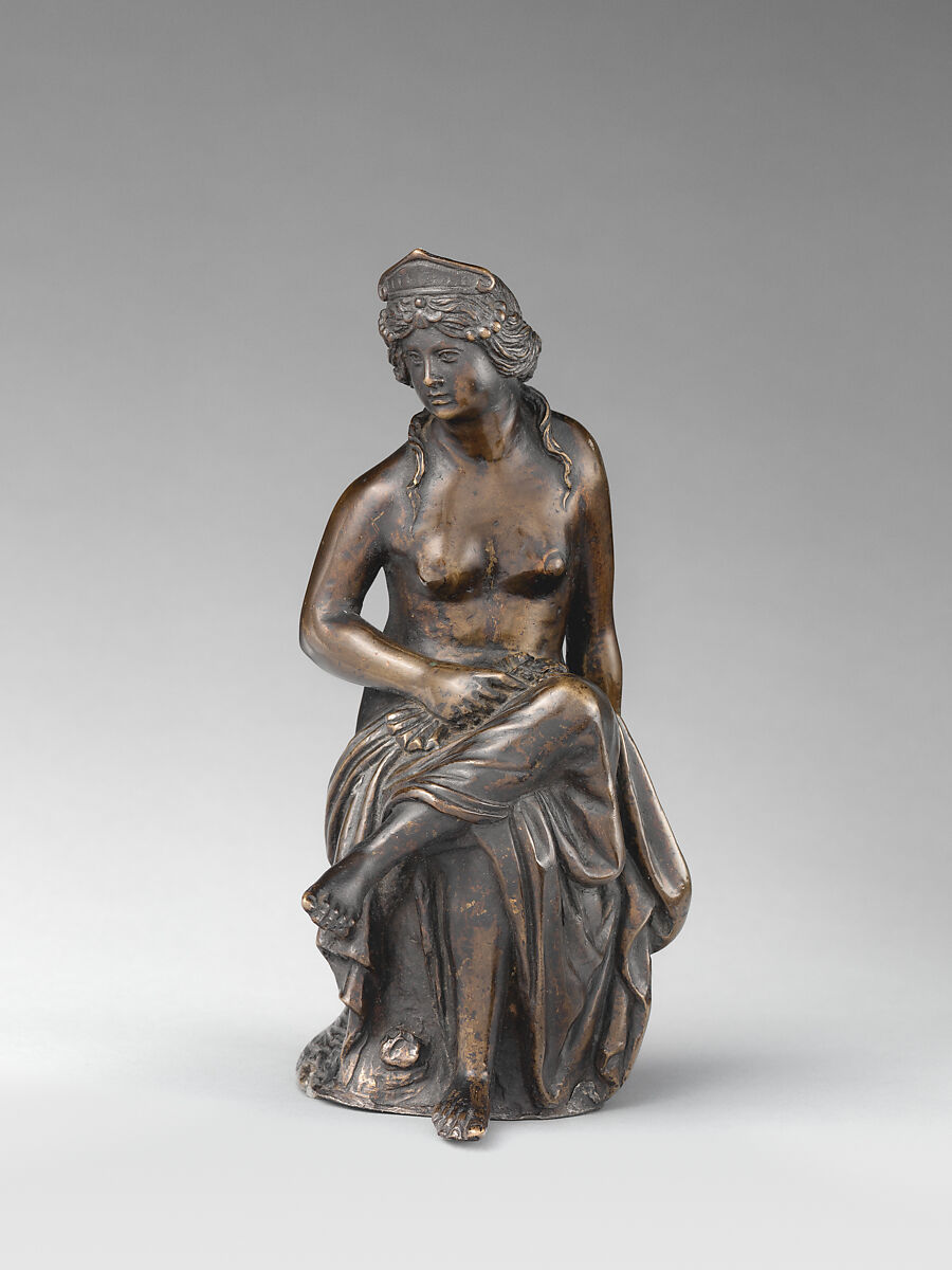 The Goddess may have been made as a cheaper alternative to the rare, costly ancient statuettes so prized by elite Renaissance collectors. The Venetian patrician Marcantonio Michiel, for example, recorded seeing seated bronze figures of classical Roman gods while visiting the important collections of Niccolò Leonico Tomeo and Pietro Bembo in Padua.[6] During Antico’s and Riccio’s lifetimes, their statuettes enjoyed the same classical authority as genuine antiquities and in later decades were confused with them. These circumstances endowed a hybrid pastiche like the Goddess with a powerful aura of classical credibility. However, the anonymous sculptor of this bronze also proved to be surprisingly inventive in his efforts to convey his ancient subject. His figure, more frontal than Antico’s, evokes the dignified posture of a deity; her outsized ornate diadem signifies she is a goddess; and the blossoms that she holds are probably attributes identifying her as Flora, goddess of flowers and springtime.
