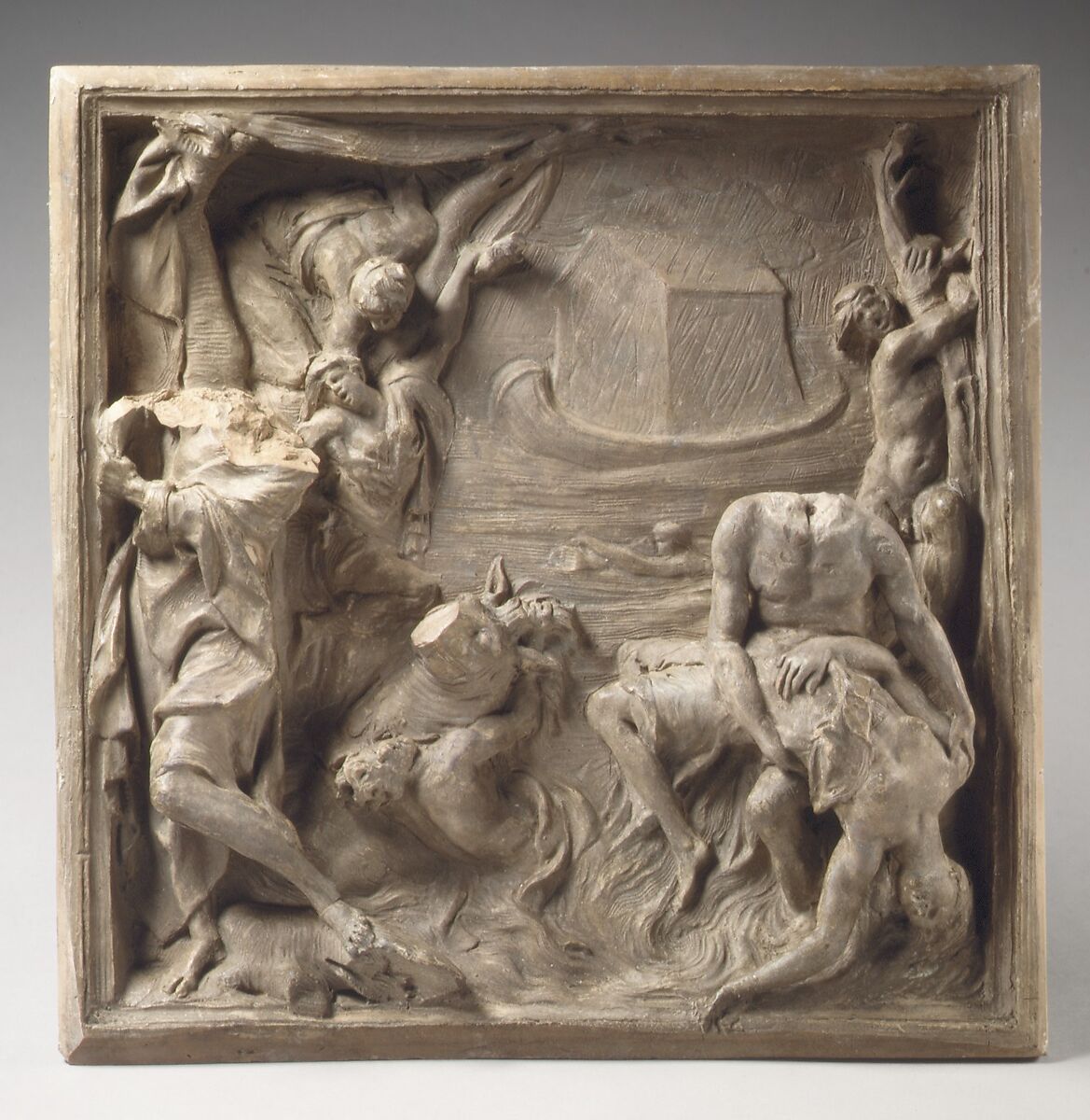 Anguier, a French-born artist active in Rome from 1641-1651, worked with Bernini and Alessandro Algardi and was one of the latter's disciples picked to illustrate Old Testament scenes for the nave of San Giovanni in Laterano. This relief is a sketch-model for one of the series of thirteen stucco reliefs, intended as models for marbles but never subsequently executed, of Old and New Testament scenes. The relief, which was low-fired, has losses that were filled with daubs of plaster, some of which are now missing. The elongated, Manneristic style is in part due to the elasticity of the medium, which often led to figures becoming attenuated in model form.