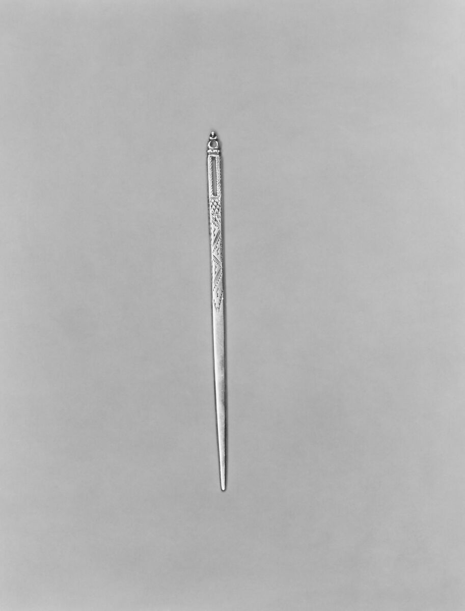 Bodkins were used both for threading laces and as hairpins. This and a related bodkin (see 1981.48.1) are decorated with simple incised patterns more usual on wood or bone articles.