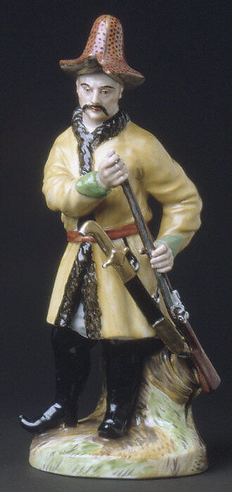 About 1780 the Imperial factory began the production of a large series of figures depicting Russian national types, of which fourteen are represented in the Linsky Collection. Like most of the figures, this figure is modeled from engravings published by Johann Gottlieb Georghi in his Description if All the Peoples Inhabiting the Russian State (editions of 1774, 1776, and later). The authorship of the models themselves is not established, but some may be attributable to Jean-Dominique Rachette (1744–1809), chief modeler at the factory from 1779 to 1804.