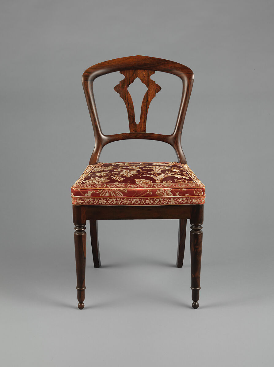 This side chair and its pair (see 2013.22.1) were originally part of a large suite of rosewood furniture made for the double parlor at Millford, a magnificent Greek Revival mansion built for John Laurence Manning (1816–1889) and Susan Hampton (1816–1845) on their Clarendon (now Sumter) County, South Carolina plantation in 1839–41. The Egyptian lotus piercing in the back splat, slender proportions and seamless shaping of the arched crest and lower back rails illustrates the blending of Classical- and Gothic Revival designs of the period. Manning likely ordered the furniture from D. Phyfe & Son during an 1840 visit to New York. According to invoices and shipping records, between 1841 and 1842, D. Phyfe & Son supplied an astonishing quantity of rosewood, mahogany, and walnut furnishings for the parlors, dining room, entrance hall, and bedchambers of his new residence. The Museum has a related window seat from Millford’s parlors (see 2006.400) in its collection.