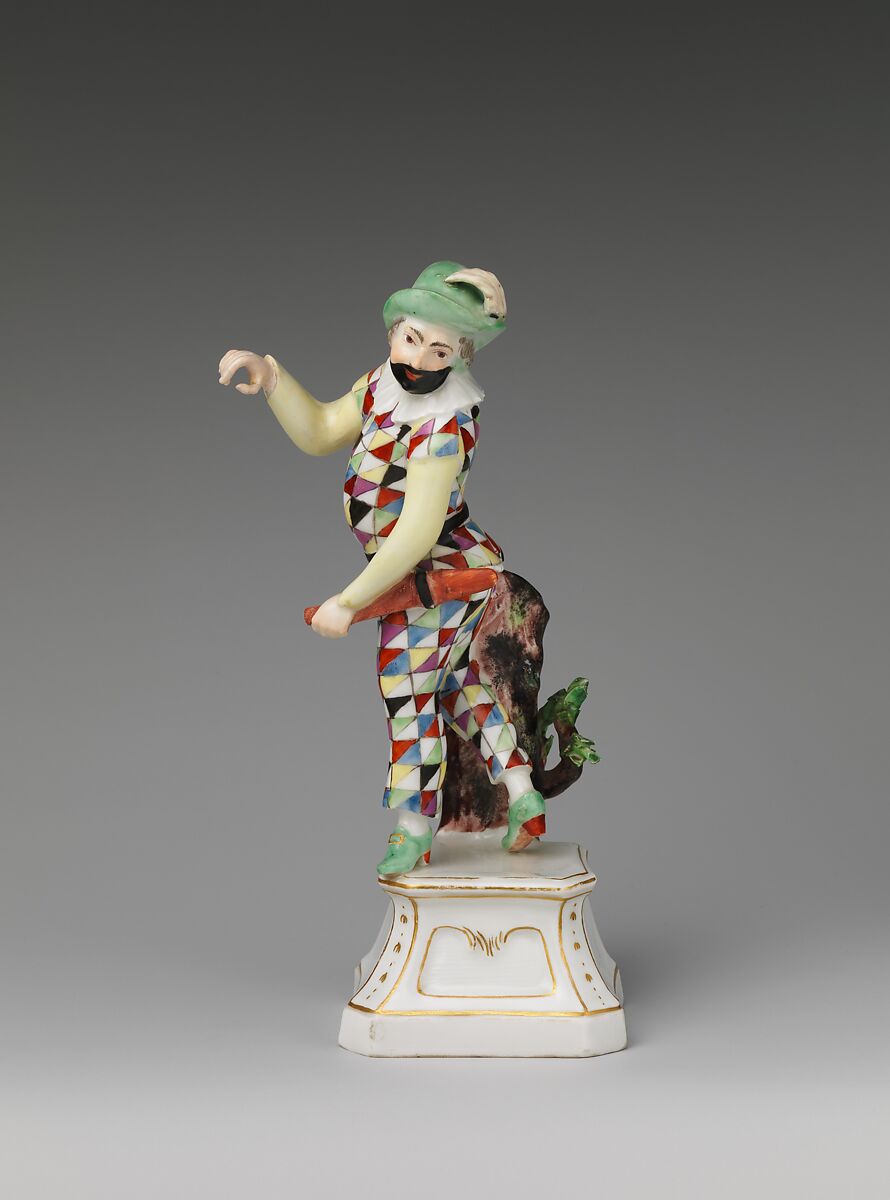 The Höchst factory was typical of most eighteenth-century porcelain enterprises both in its reliance on the expertise of workers trained elsewhere and its consistently shifting roster of employees. The factory’s modelers, kiln technicians, and painters were constantly changing, and it was not uncommon for people in key positions to remain for only a few years before moving on to another factory. The factory employed four different modelers in the early 1750s when the Museum’s figure of Harlequin was made, and the identity of its modeler has been the subject of debate.[3]