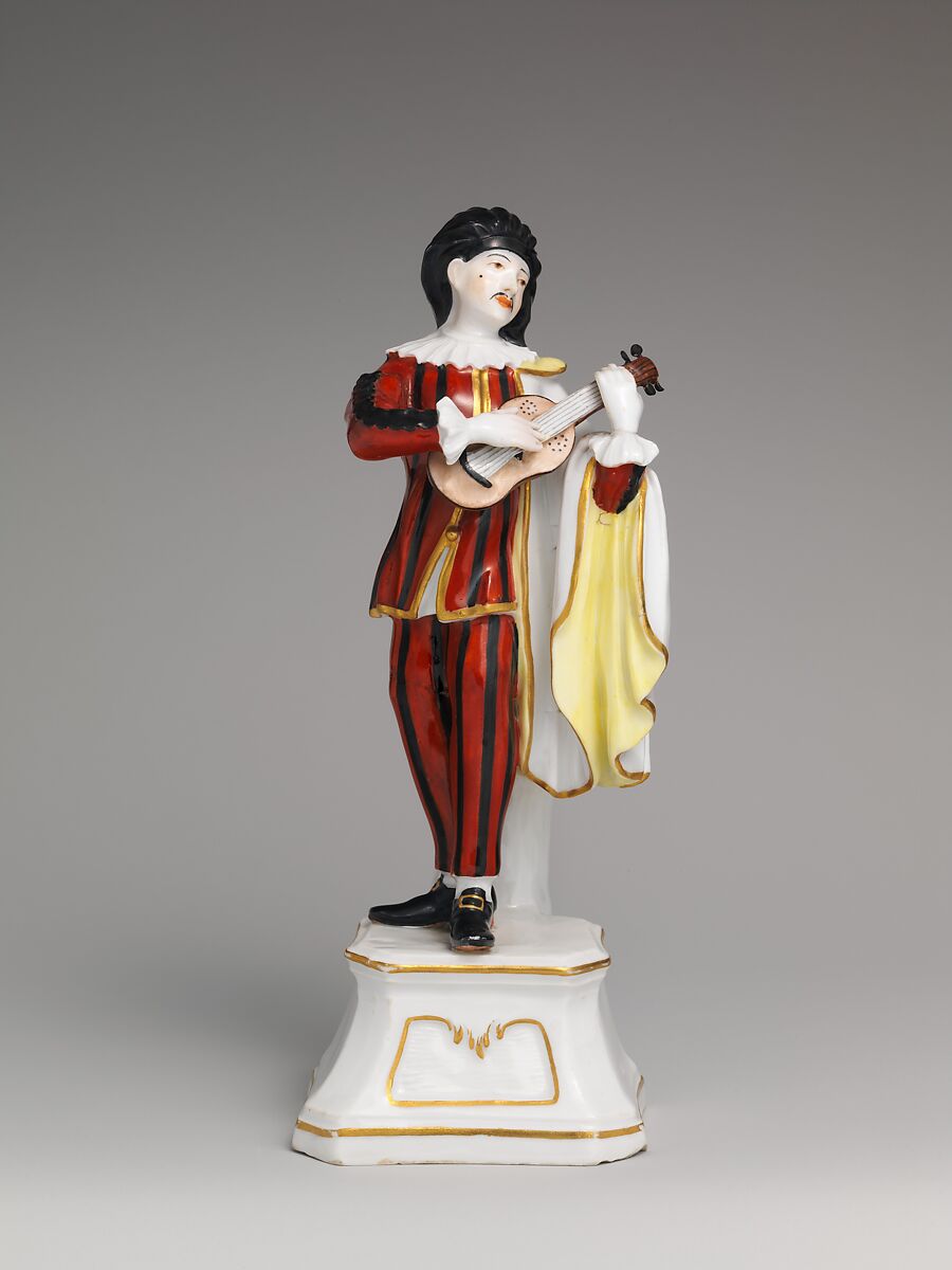 Like its printed source, the present Höchst figure sports a guitar and wears generic servant garb: a loose beret, a thigh-length jacket with ruff collar, long pants, and a cape. The porcelain painter likened it to Mezzetin by covering the costume with multicolored vertical stripes. Exactly the same iconographic type appears under different names in eighteenth-century visual sources, including Mezzetin and Jean Gurgulo. These inconsistencies show that the iconography and nomenclature of commedia dell'arte characters were subject to both artistic license and commercial considerations, such as the effort to maximize sales by diversifying as much as possible the market offering, be it prints or porcelain figures.
