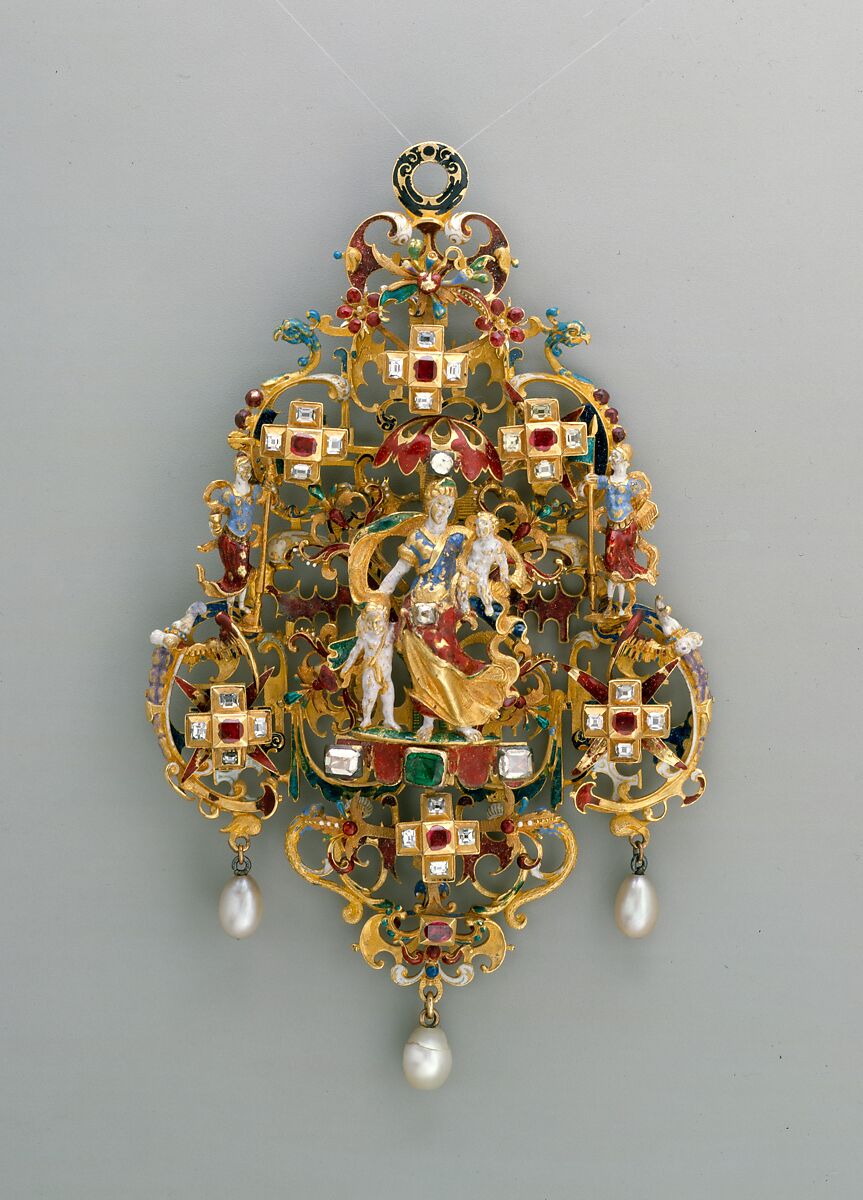 Yvonne Hackenbroch attributed this jewel to an Augsburg goldsmith working in the style of Daniel Mignot, a French Huguenot ornamental engraver, who was in Augsburg in the early 1590s and published a large number of engraved designs for jewels. A few of these are in the style associated with the Augsburg enamel work of David Altenstetter of around 1600, but many more have the airy, open, scrolled backs, decorated with swags and grotesques like those found on the reverse side of this pendant. One series of designs, dated 1593, illustrates pendants decorated with the Cardinal Virtues, including Charity clad only in a loose, open robe. Mignot’s designs must have circulated widely, for at least three of them from the series of the Virtues were copied with minor revisions by Johann Israël and Johann Théodore de Bry. The goldsmith who made this jewel has modified the Mignot designs considerably, but he must have had extensive knowledge of them, for he adopted decorative details from several engravings in different series.