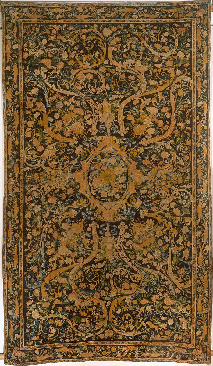 Contemporary with Louis XIV's rise to power in 1661, this carpet elegantly illustrates aspects of earlier French design while being a harbinger of the later Savonnerie production made specifically for the Sun King. The work is closely related to the so-called Louis XIII carpets, examples of which postdate that monarch's death in 1643. Characteristic of this group is a profusion of flowers enclosed by a central medallion, gathered in elaborate arrangements, and strewn throughout a field that is usually black, as in the present work. These carpets also exhibit a clearly defined border and a simple guard pattern. Indicative of the forthcoming transition to the grandeur of the more severe and classical style of later carpets, such as those made for the Grande Galerie of the Louvre, of which two examples are currently on display in the Wrightsman Galleries, are the large, scrolling acanthus leaves that simultaneously divide, organize, and enliven the field, as well as motifs such as grotesque heads, which here support golden bowls piled with fruit.