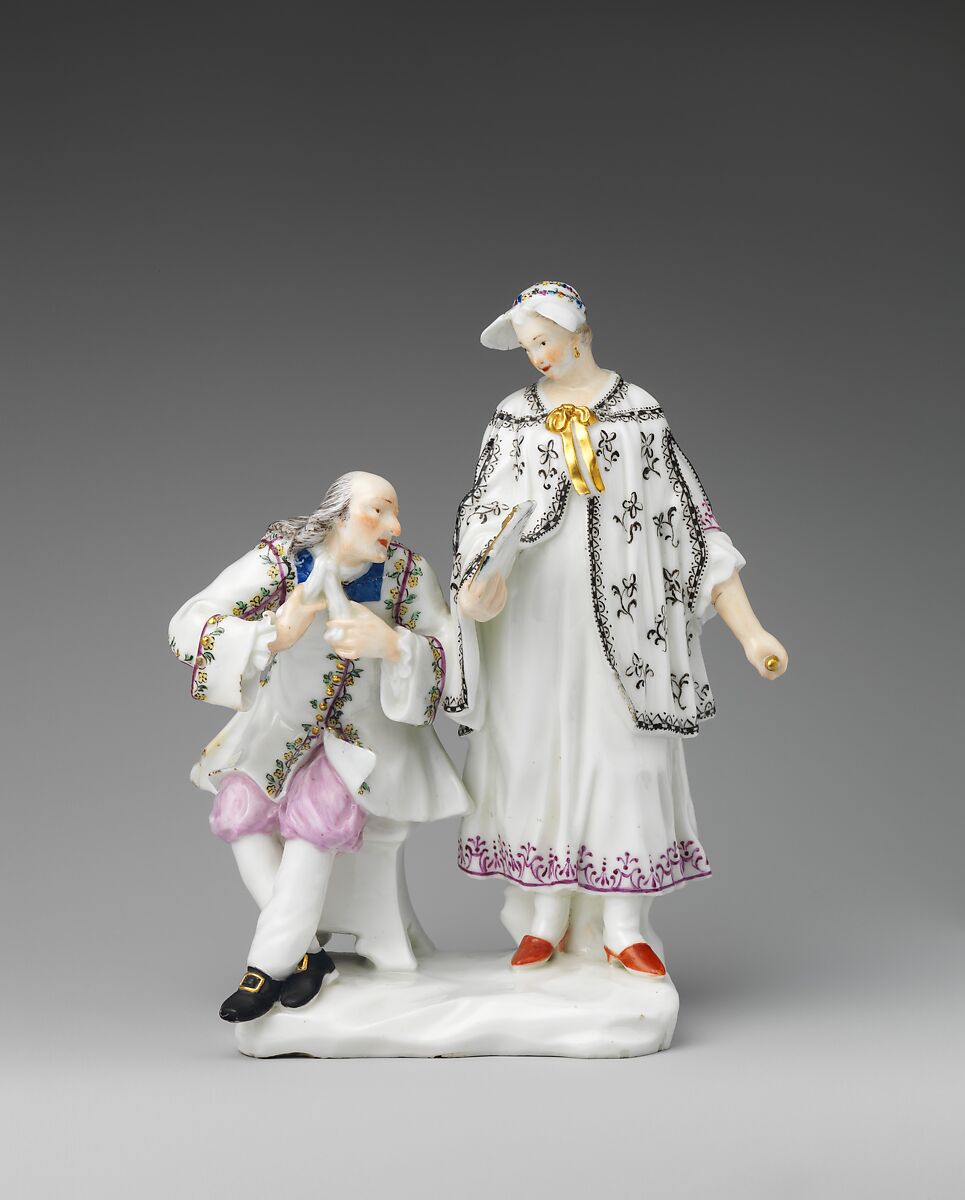 The subject of this group is uncertain. When recorded in 1935, it was entitled Rosaura and the Doctor, thereby identifying it as a scene from an Italian Comedy play in which one of the heroines, or Innamorate, attends her father, the Doctor. (The Innamorate were assigned different names in different scenarios: Rosaura is mentioned by the Venetian writer Carlo Gozzi in his memoirs, published in 1797.) One of the four original masks, or central characters, of the commedia dell’arte, the Doctor is traditionally costumed in a short black cloak, a wide white neck ruff, and a flat-brimmed black hat, thus calling into question the identification here. What Is certain, however, is the quiet drama of the composition, in which the younger woman gently assists the older man in his dressing.