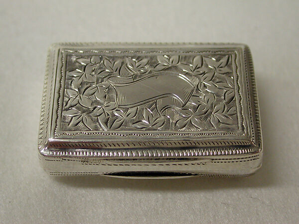 A vinaigrette was intended to hold a tiny sponge dipped in aromatic vinegar. Its interior is gilded to protect the silver from oxidation caused by the acidity of the vinegar. A hinged and decoratively pierced inner lid or grill kept the sponge in place while its perforations allowed the odor to waft through. A whiff of the vinegar might revive someone from a fainting spell. Such vinaigrettes were worn around the neck, on a chatelaine suspended from the waist, or carried in a pocket.