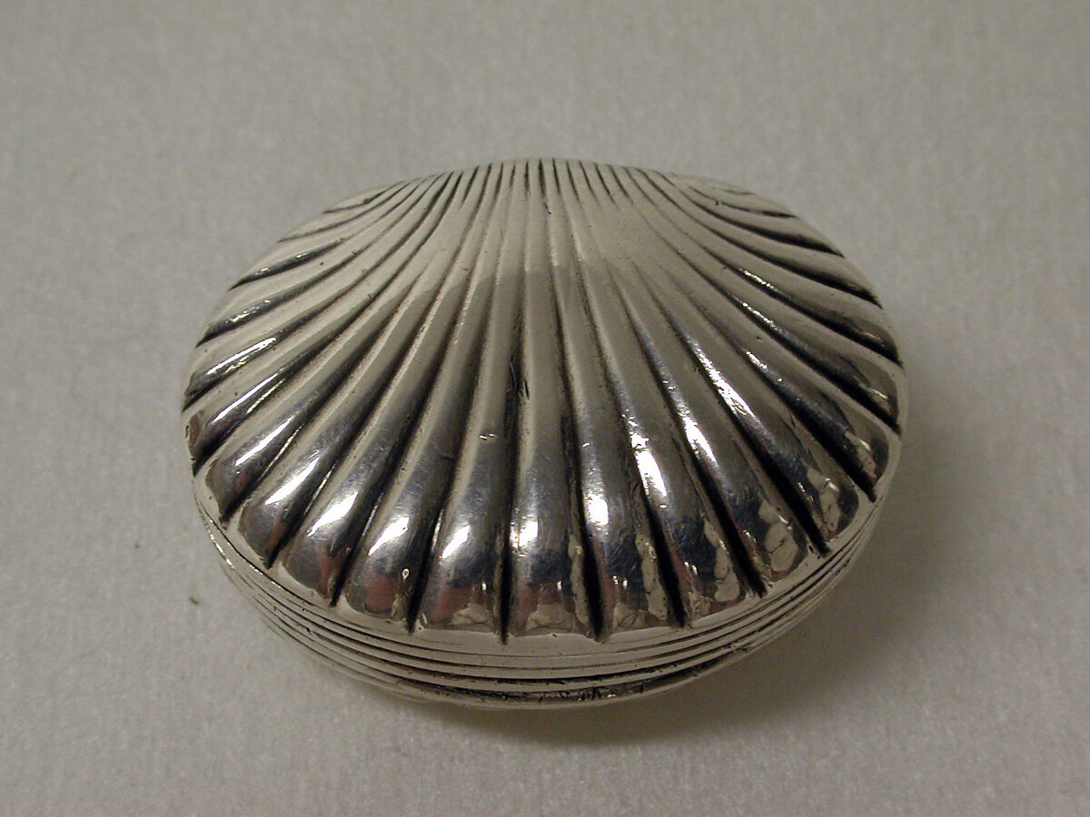 This shell-shaped vinaigrette from the Reis collection is quite unusual in its form. Other than the anchor mark adopted by the assay office in Birmingham, there are no additional marks which would identify the maker and date of manufacture. A similar vinaigrette was made by Matthew Linwood (1754–1825) in 1813 which could suggest a possible manufacturer and date for The Met’s piece. A similarly unmarked scallop-shell vinaigrette, dated 1816-17, is in the collection of The Art Institute, Chicago.